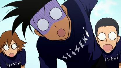 Ihr kennt das, ihr gebt 200 Euro für den Import von DVDs aus und wenn ihr die letzte der drei Folgen released, kommt gleich am nächsten Tag ein Eng Sub raus. Es gibt nur eine vernünftige Reaktion darauf, nämlich diese hier. Aber gut, auf zur Folge! Das Spiel gegen Touin ist vorüber und es ist Party angesagt. Richtig, ich spreche von der obligatorischen Strand-Episode. Wir kriegen Chikako im Bikini zu sehen, allerdings nur kurz. Das spricht dafür, dass sich die Folge mehr an die weibliche Zuschauerschaft richtet. Allerdings wäre es kein Sportanime, wenn nicht zufällig die Saku-Schule auftauchen würde. Sie fordern Seiseki zum Strand-Fußball heraus.